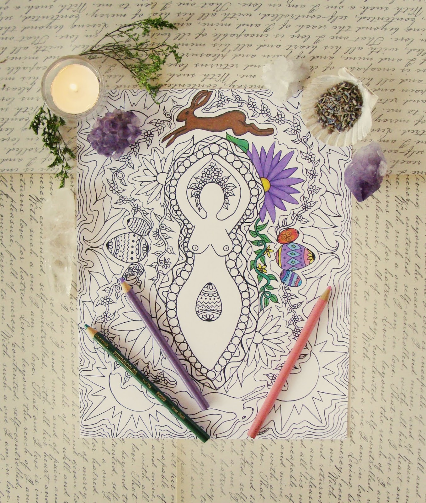 Since Ostara is right around the corner I decided to have a giveaway for my Spring Goddess mandala coloring page. This mandala is all about Spring with rabbits, decorated eggs, flowers, leaves and shining suns. Coloring is a great meditative tool to use to clear your mind and connect with your inner self. You can color this mandala and place it on your Ostara altar or you can choose to color the mandala on the day of Ostara in order to connect with the energy of Spring.
